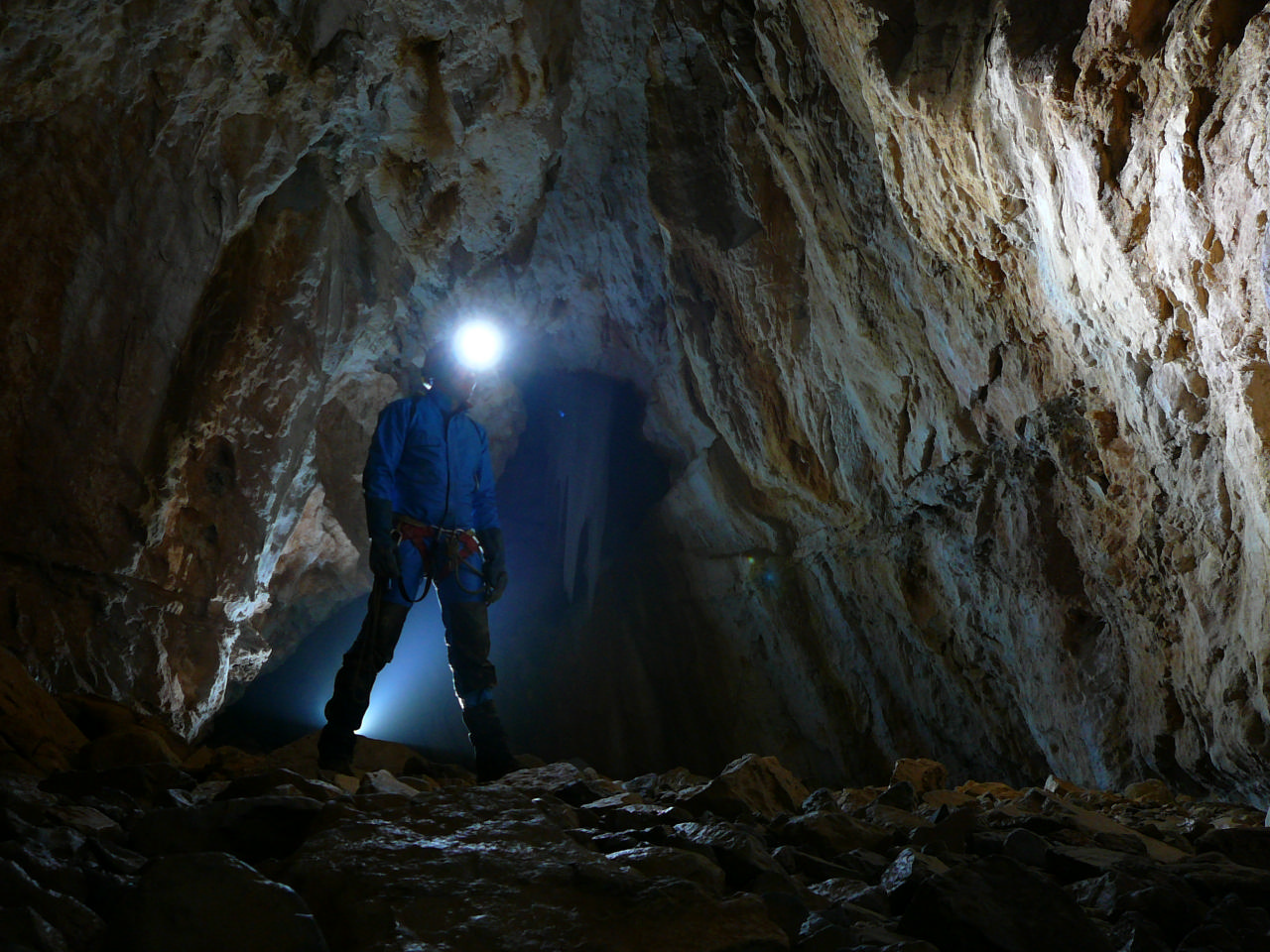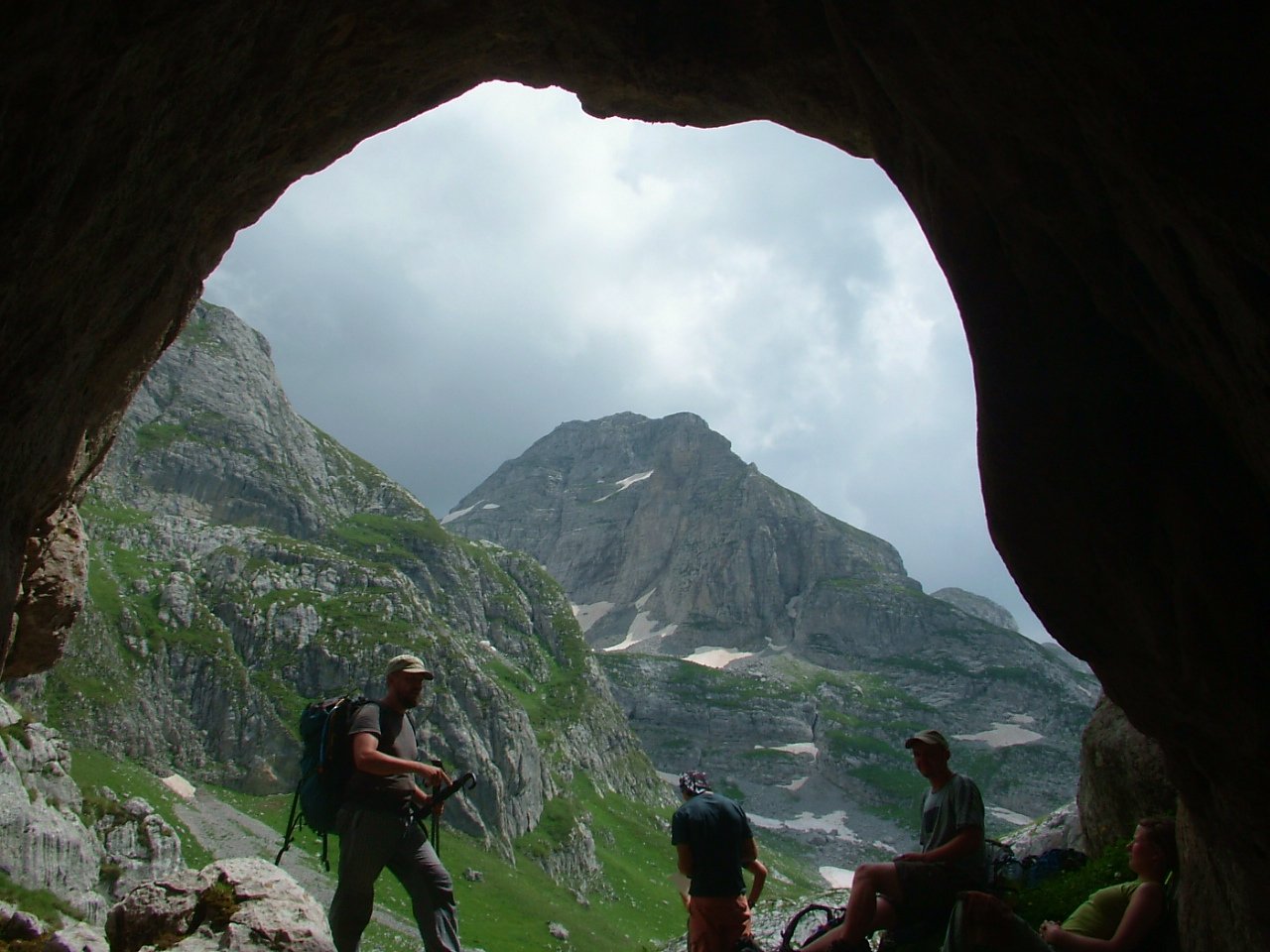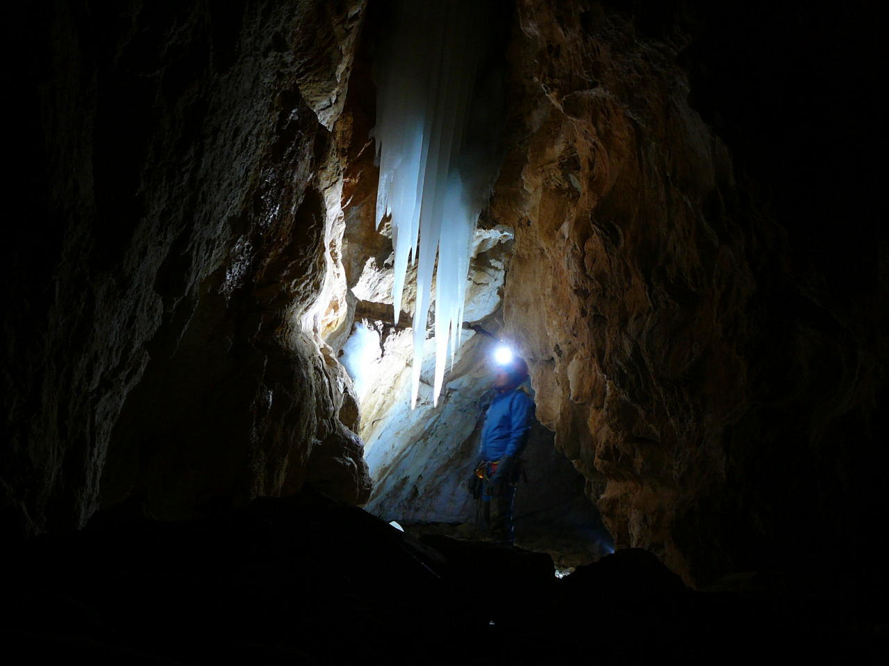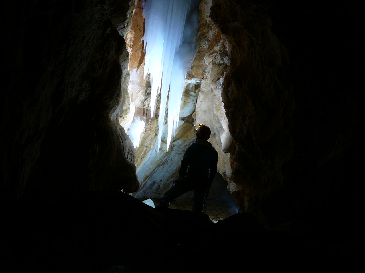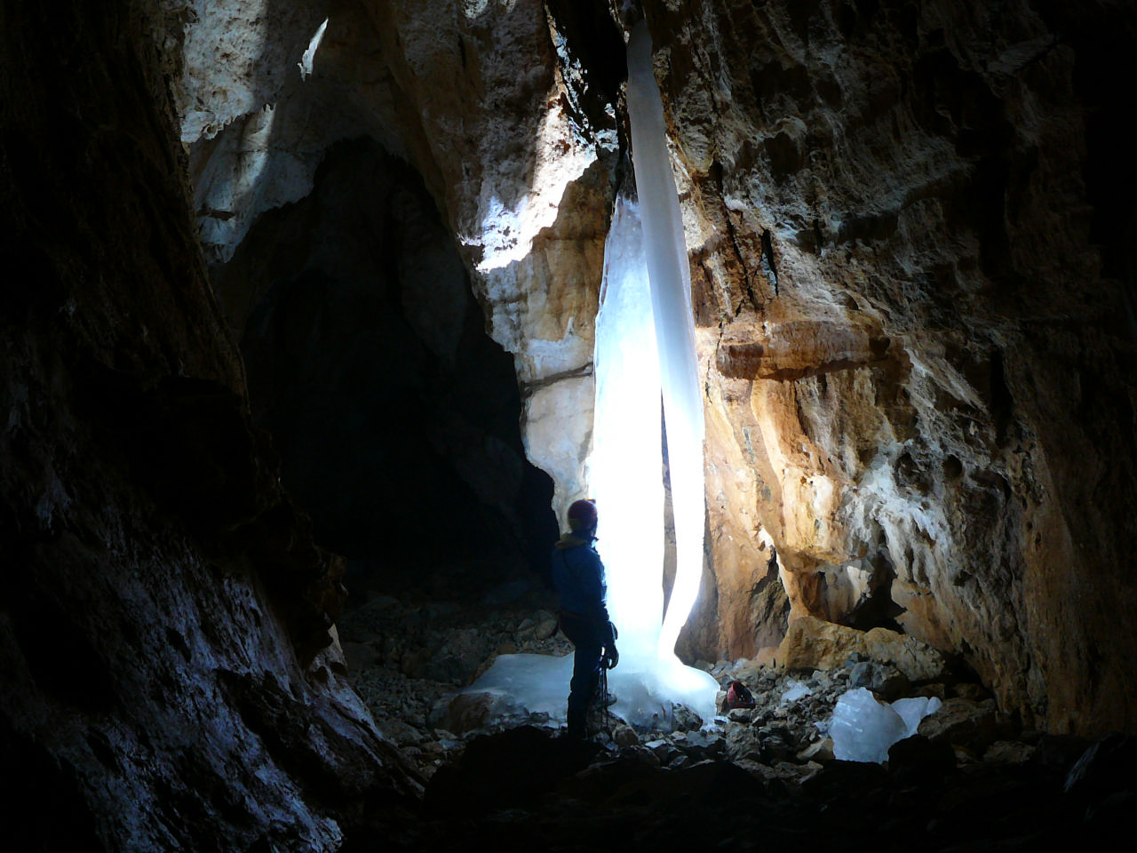 Jaskinia Lodowa znajduje się w zachodniej części masywu (okolice Maja Kalata, 2053 m n.p.m.), w dolince biegnącej w kierunku przełęczy Cafa e Preslopit. Początek jaskini to system studzienek doprowadzający na głębokości 40 m, gdzie rozpoczyna się obszerny poziomy ciąg jaskini. Ciąg ten urywa się na końcu systemem dużych studni, doprowadzającymi do ponad 400 m głębokości, skąd jaskinia kontynuuje się dalej.