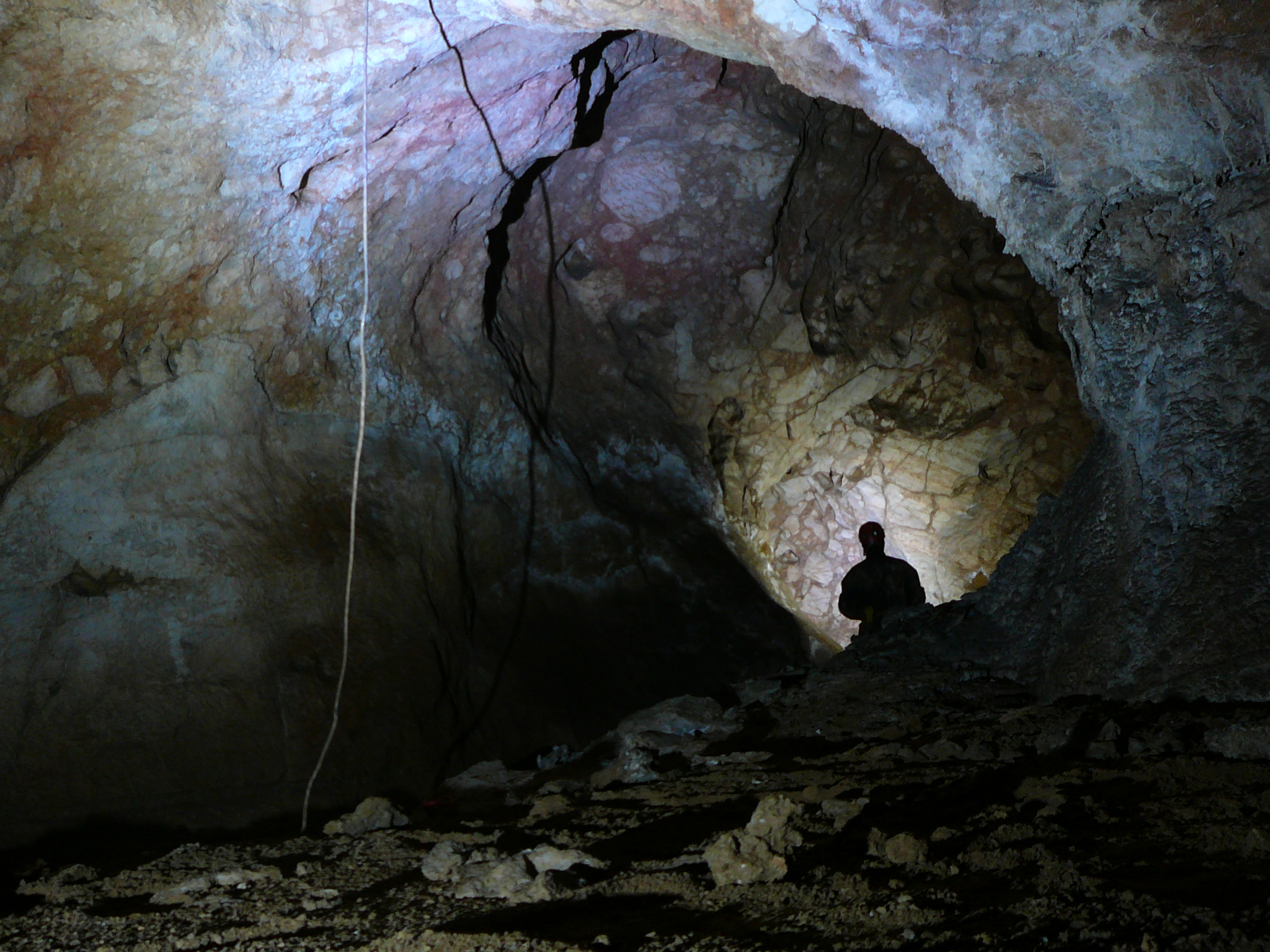 Główny meander to korytarz o wysokości do 20 m i szerokości do 7 m , w stropie którego występują kominy osiągające wysokość co najmniej kilkudziesięciu metrów. Od środkowej części meandra odchodzi rozgałęziony system mytych korytarzy wznoszących się w górę masywu i wyeksplorowany dotąd do podstawy stromego komina. Dno jaskini pokryte jest różnego rodzaju osadami, zarówno gliniastymi jak i żwirowymi osiągającymi czasami w przekroju miąższość kilku metrów. Na niektórych fragmentach spągu korytarzy występują liczne nacieki grzybkowe tworzące specyficzne bardzo kruche pokrywy naciekowe. W najniższym zbadanym punkcie jaskini eksplorację przerwano nad kilkunastometrową studzienką z silnym przewiewem powietrza. Eksploracja możliwa jest również w górnych partiach w namierzonych kominach. Prawdopodobnie łączą się one z jaskiniami zlokalizowanymi w północnej części szczytu Maja Kalata na wysokości 2400 m npm w rejonie wielkiego leja krasowego o średnicy około 200 m.