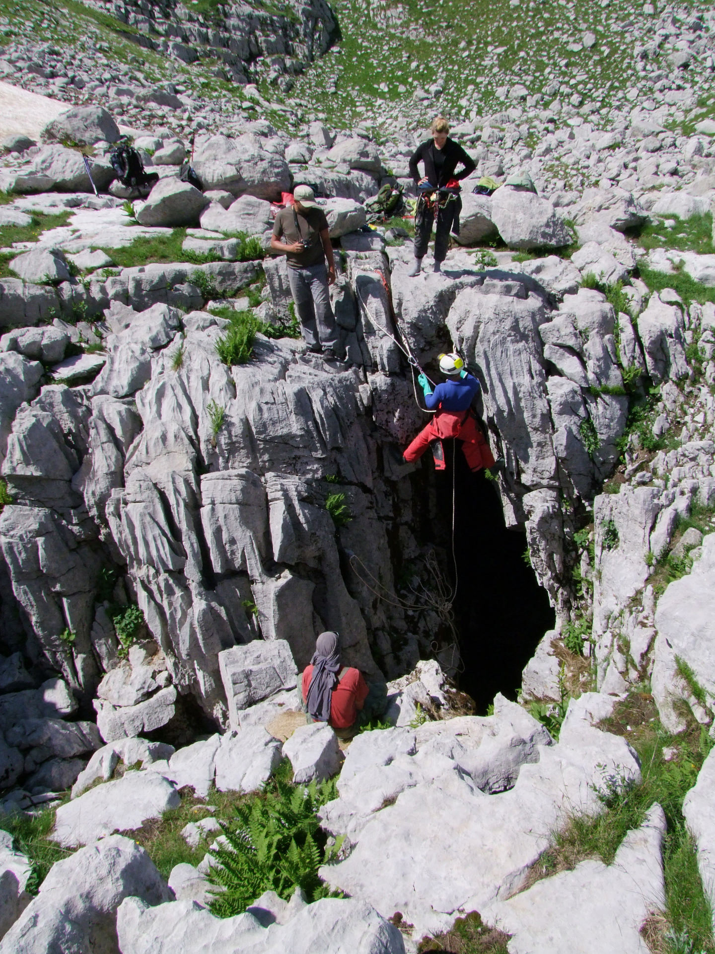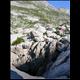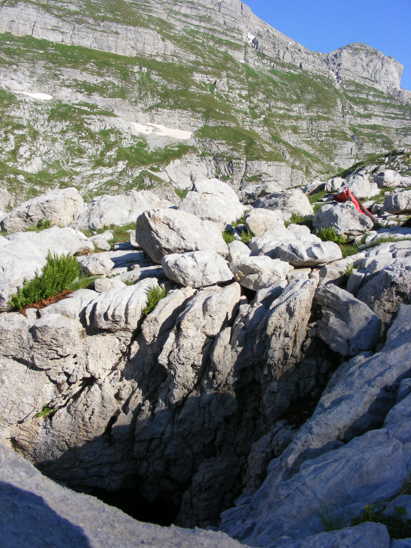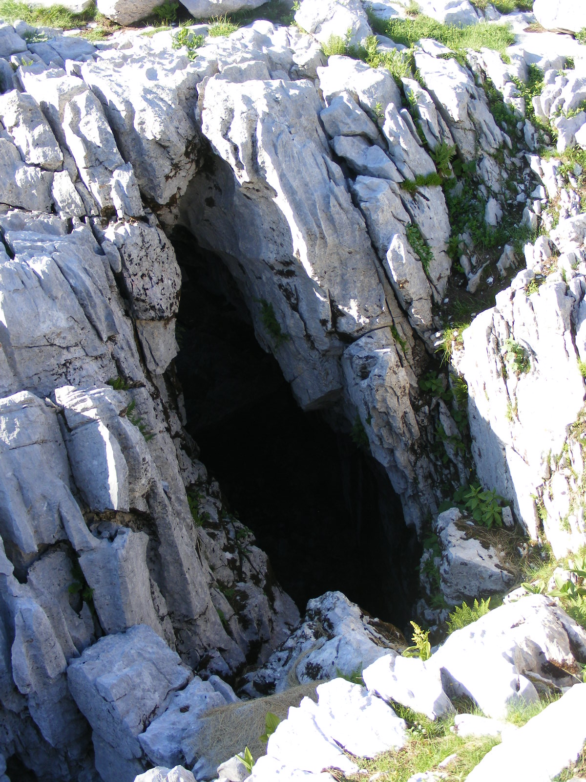 Opis dojcia: Z Caf Bora idziemy czerwonym szlakiem prowadzącym na Maja Kolata. W dolince O nazwie Skripa mijamy po prawej stronie otwór Jaskini Lodowej. Dalej dochodzimy do przełęczy Cafa e Preslopit. Z tego miejsca odbijamy w prawo pod górę by po około 300 metrach dojść do lapiazu gdzie znajdują się dwa otwory jaskini.