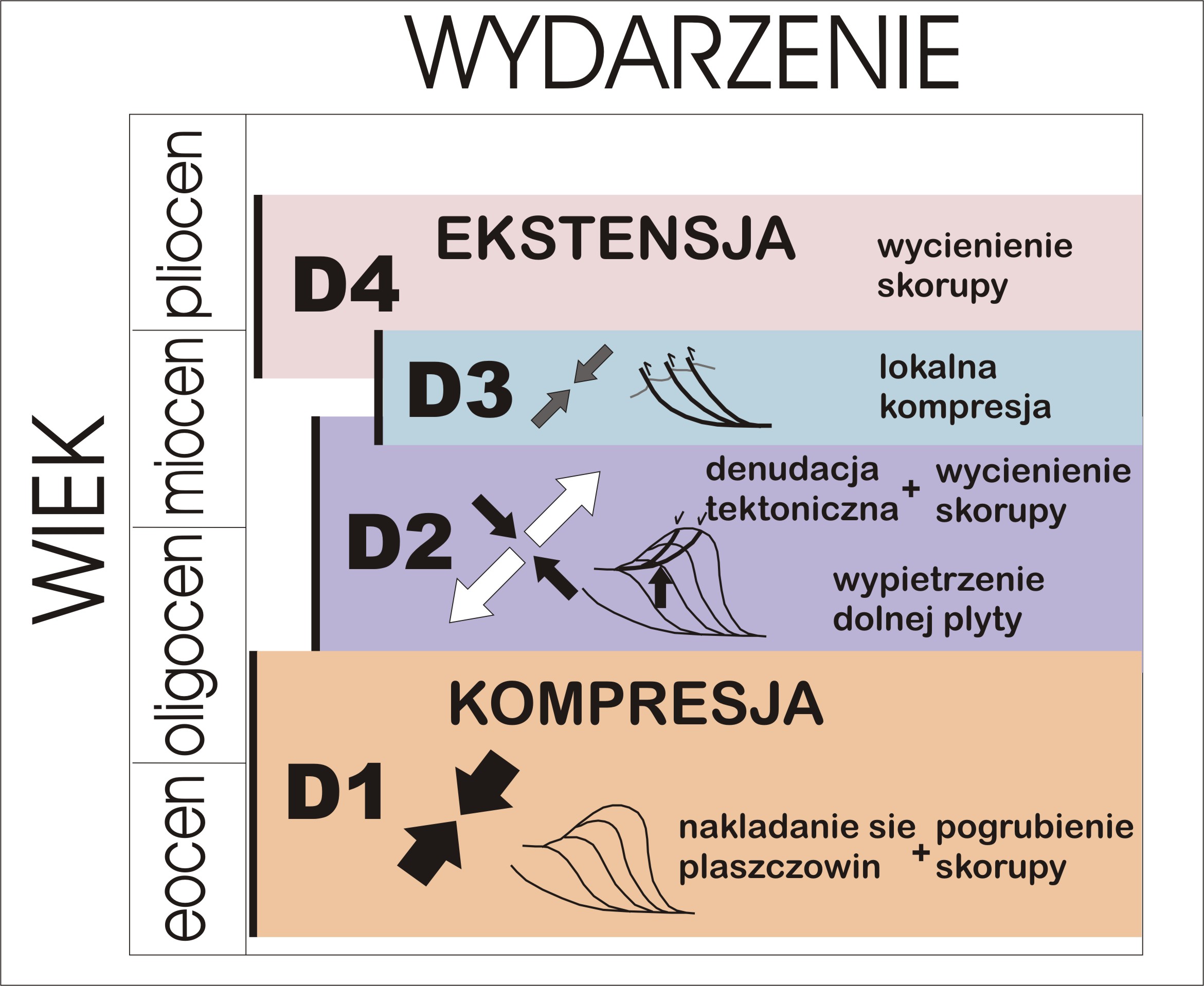 Ryc.3 Zjawiska 4 głównych faz deformacji pasa albanidów w trzeciorzędzie (wg Kilias et al. 2001).