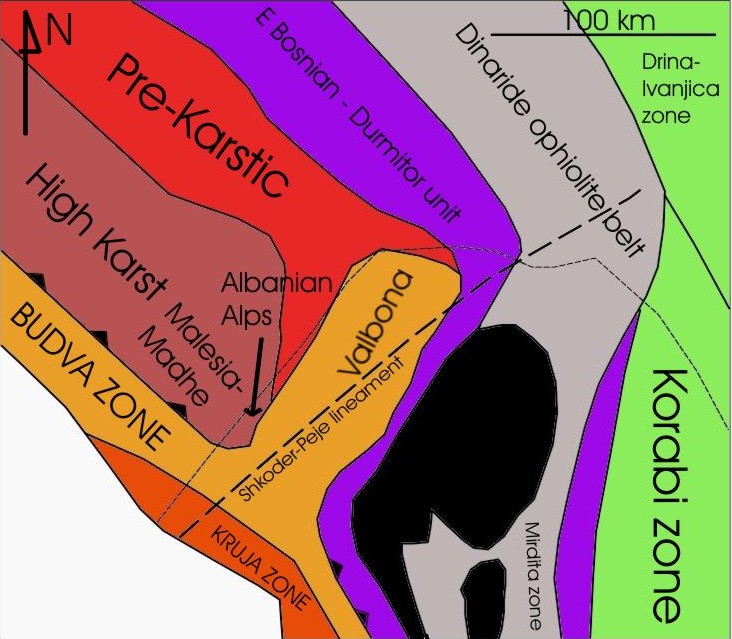 Na całym obszarze Alp Albańskich na regionalną tektonikę znaczący wpływ ma nieciągłość jednostek tektonicznych związana ze strefą o przebiegu NW-SE zwaną lineamentem Shkoder – Peje, interpretowaną jako kopalny uskok transformujący (Dercourt, 1964; Robertson & Dixon, 1984). Alpy Albańskie zostały zdeformowane w wyniku kolizji postępującej w oligocenie i miocenie, która doprowadziła do powstania wysokokątowych uskoków odwróconych i fałdów.